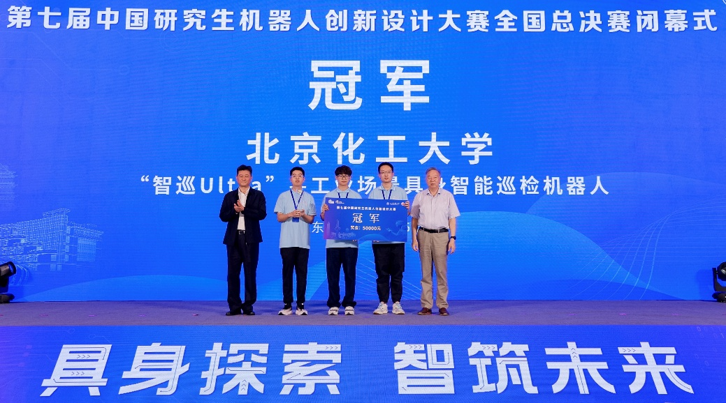 After two days of intense competition, the team "Hua'an Zhixun" (Chemical Safety Intelligent Inspection), composed of Huo Dongjie, Wang Zixu, Wang Dengshuo, Yu Sihuang and Yan Yukang under the guidance of Professor Cao Zhengcai and Associate Professor Zhang Dong from the College of Information Science and Technology, won the national championship with their entry titled "Zhixun Ultra"—Embodied Intelligent Inspection Robot for Industrial Scenarios. This achievement marks a historic breakthrough for the university in winning this award (breaking the university's "zero record" in this award category).