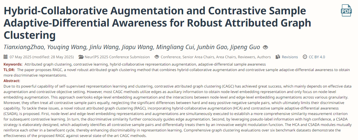 Recently, the acceptance results for the 39th Annual Conference on Neural Information Processing Systems (NeurIPS 2025) were announced. The research paper titled Hybrid-Collaborative Augmentation and Contrastive Sample Adaptive-Differential Awareness for Robust Attributed Graph Clustering, led by Professor Wang Youqing from our school, was successfully accepted.