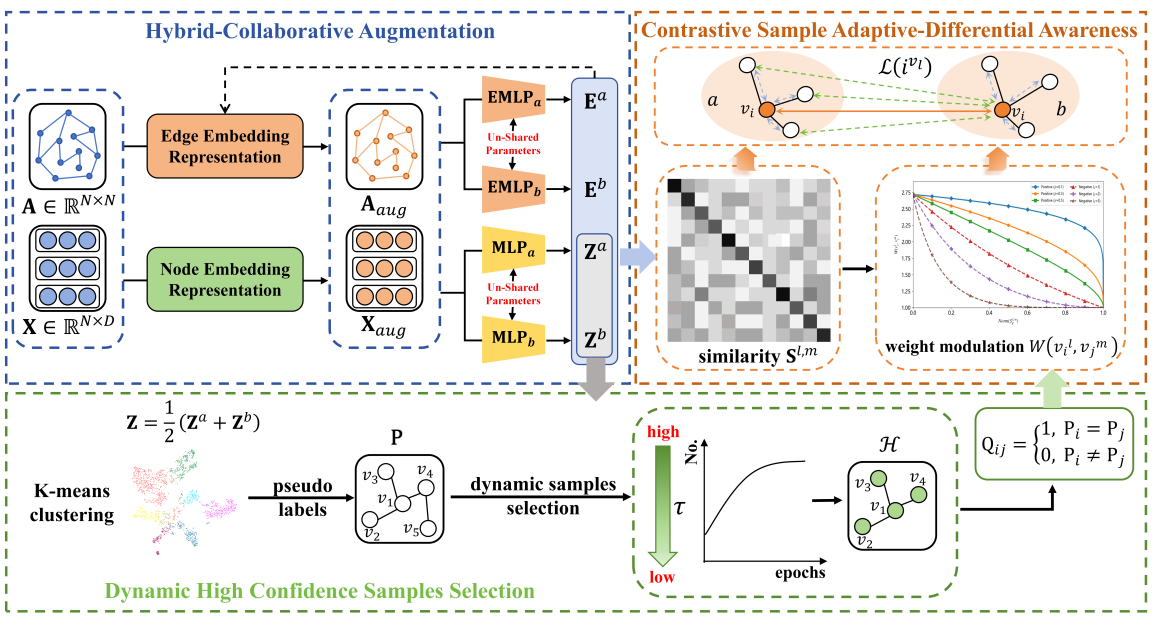 RAGC establishes a more comprehensive similarity metric for subsequent contrastive learning by simultaneously performing node-level and edge-level embedding representation and enhancement. Furthermore, it uses a dynamic similarity discrimination matrix to guide edge-level embedding enhancement. Secondly, by leveraging dynamically extracted high-confidence pseudo-label information, RAGC elaborately designs a contrastive sample adaptive differential awareness strategy. This strategy can adaptively identify contrastive sample pairs, realize adaptive differentiation of different contrastive sample pairs, and provide a more comprehensive and in-depth contrastive strategy for contrastive learning.