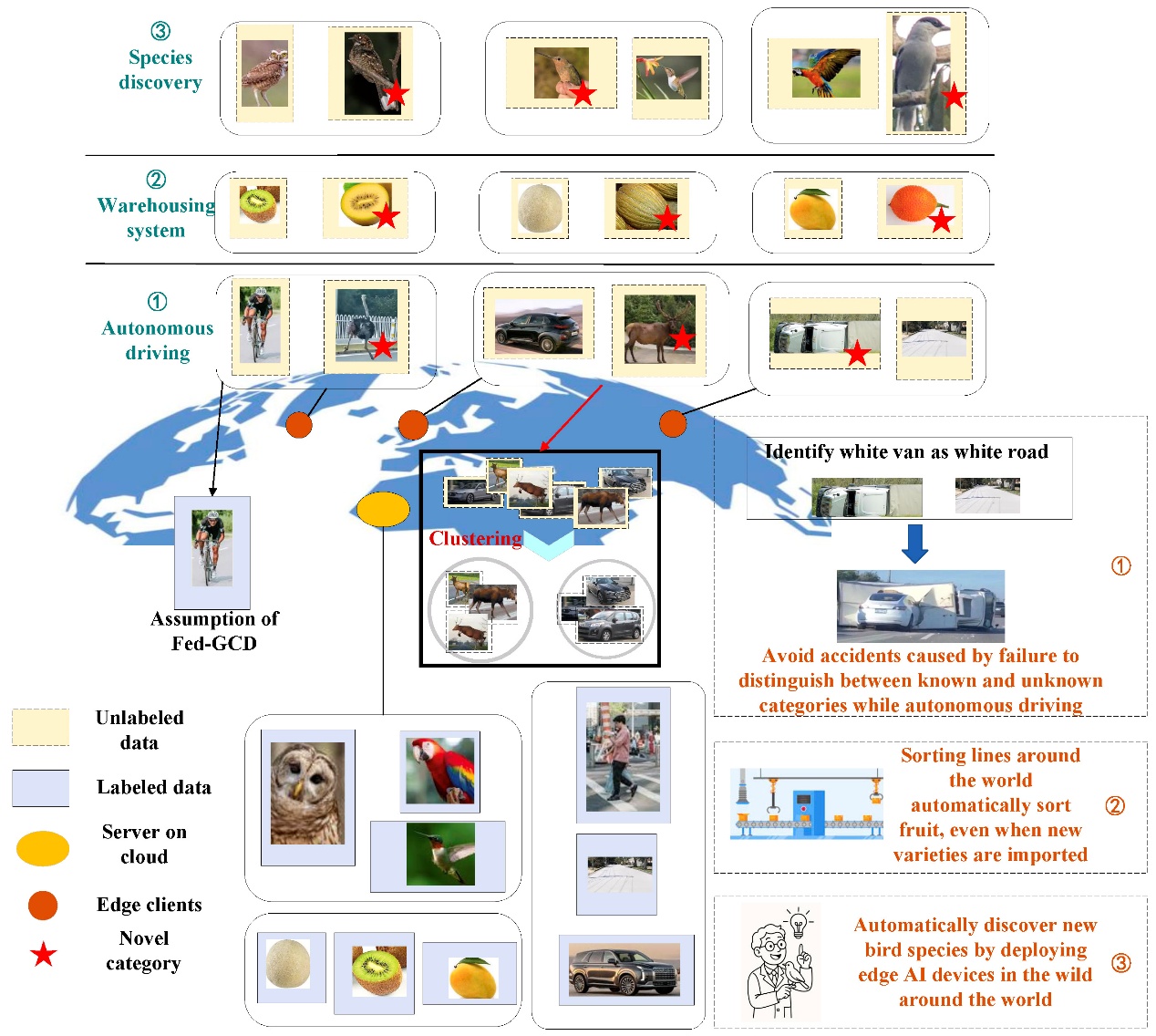 The accepted paper is titled Collaborative Cloud-edge Generalized Category Discovery. This work focuses on the Cloud-edge Generalized Category Discovery (CE-GCD) task. Specifically, decentralized product users typically require automated category discovery but cannot or are unwilling to provide any annotated data. Instead, they need to realize automatic discovery and recognition of new categories from a dataset containing labeled and unlabeled instances through unsupervised learning and knowledge transfer on the client side. To address this problem, the paper proposes a GCD framework that combines energy-guided known category recognition and a multi-level contrastive learning strategy. In each client, the classifier of the base model is first used to distinguish between known and unknown categories, followed by unsupervised learning on the unknown categories. Each client transmits category information through category prototypes to support learning. Experiments on multiple datasets demonstrate that this method achieves promising results.