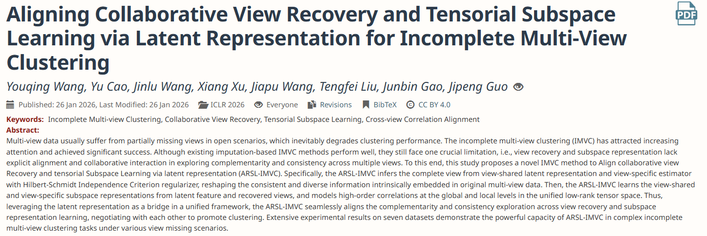Recently, the results of the 14th International Conference on Learning Representations (ICLR 2026) have been announced.A research paper titled Aligning Collaborative View Recovery and Tensorial Subspace Learning via Latent Representation for Incomplete Multi-View Clustering by the team led by Professor Wang Youqing from our college has been accepted.