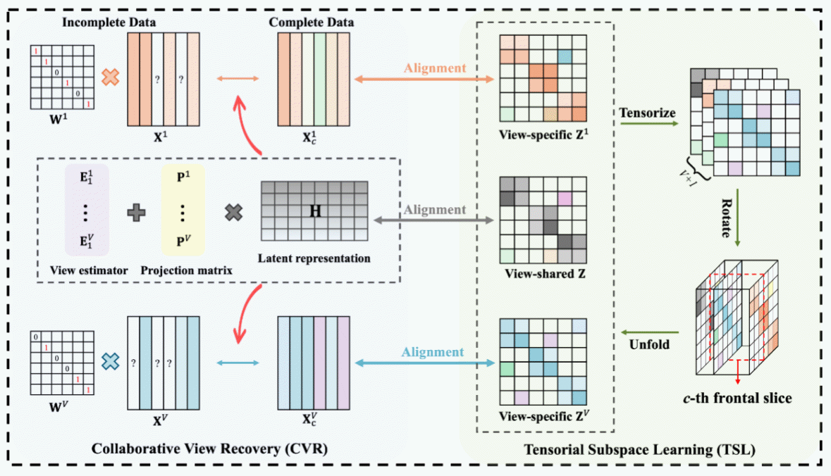 This study addresses the limitation that existing incomplete multi-view clustering methods lack explicit semantic alignment and collaborative interaction between view recovery and subspace representation when exploring cross-view complementarity and consistency. To this end, a novel tensor-based incomplete multi-view subspace clustering method, termed ARSL-IMVC, is proposed.