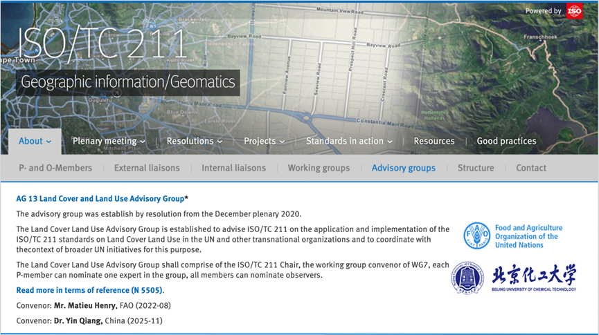 The mission of ISO/TC 211/AG 13 is to promote the application and implementation of ISO international standards related to land cover and land use within the United Nations and other international organizations.At present, Yin Qiang from our university and Matieu Henry from the Food and Agriculture Organization of the United Nations (UN-FAO) serve as joint conveners.